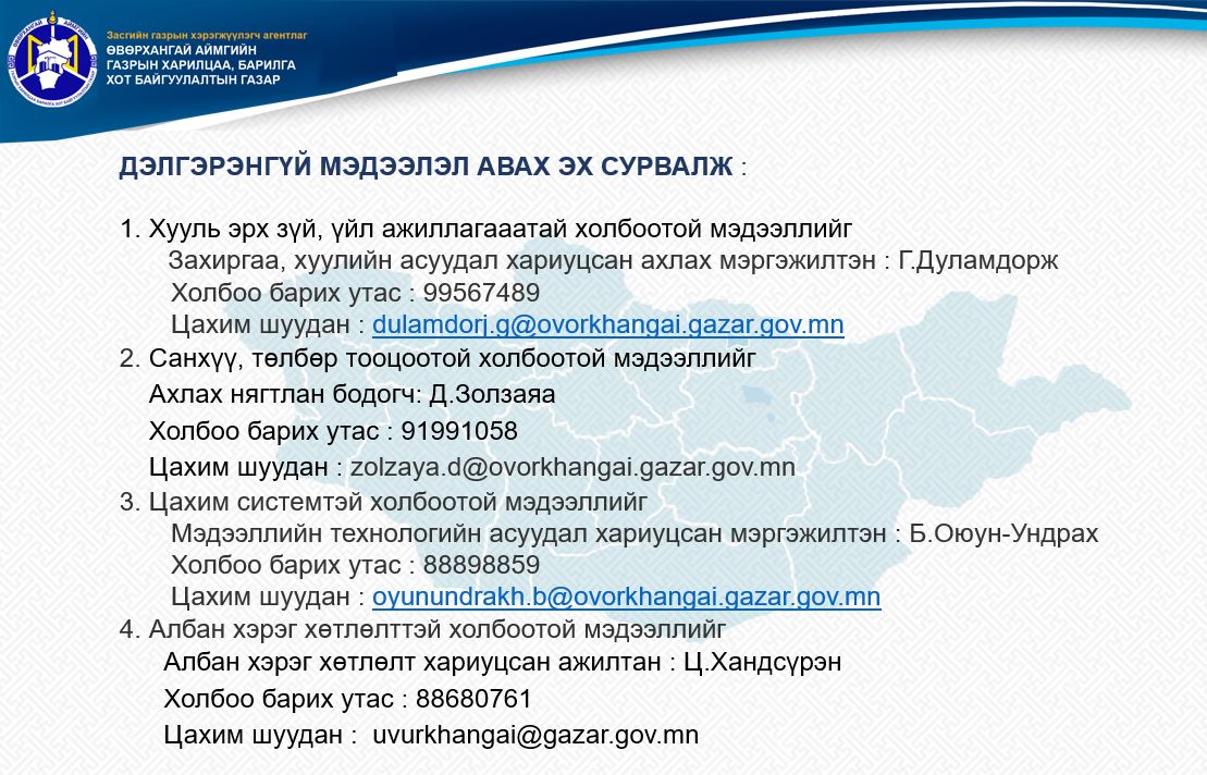 Цахим шуудан : zolzaya.d@ovorkhangai.gazar.gov.mn