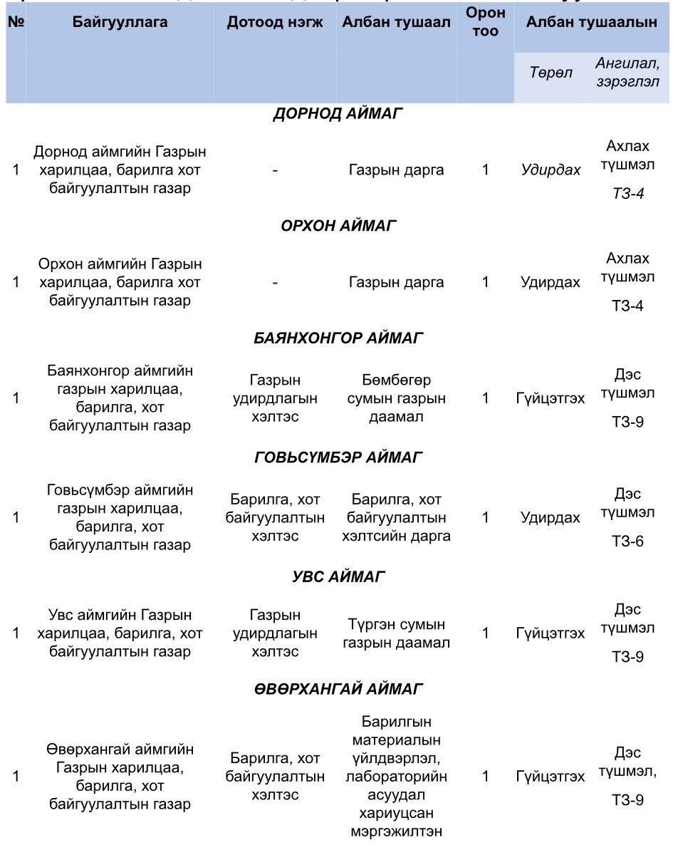 Төрийн албаны зөвлөлийн Газар зохион байгуулалт, геодези, зураг зүйн ерөнхий газрын дэргэдэх салбар зөвлөлөөс зохион байгуулах Дорнод, Орхон, Баянхонгор, Говьсүмбэр, Увс, Өвөрхангай аймгийн Газрын харилцаа, барилга хот байгуулалтын газрын Удирдах, гүйцэтгэх албан тушаалын сул орон тоо нөхөх сонгон шалгаруулалтын зарыг 2026 оны 02 дугаар сарын 03-ны өдрөөс 02 дугаар сарын 16-ны өдрийг дуустал хугацаанд Төрийн албаны зөвлөлийн шалгалтын цахим систем https://hh.csc.gov.mn, Газар зохион байгуулалт, геодези, зураг зүйн ерөнхий газрын https://www.gazar.gov.mn цахим хуудсуудад олон нийтэд нээлттэйгээр байршуулсан.