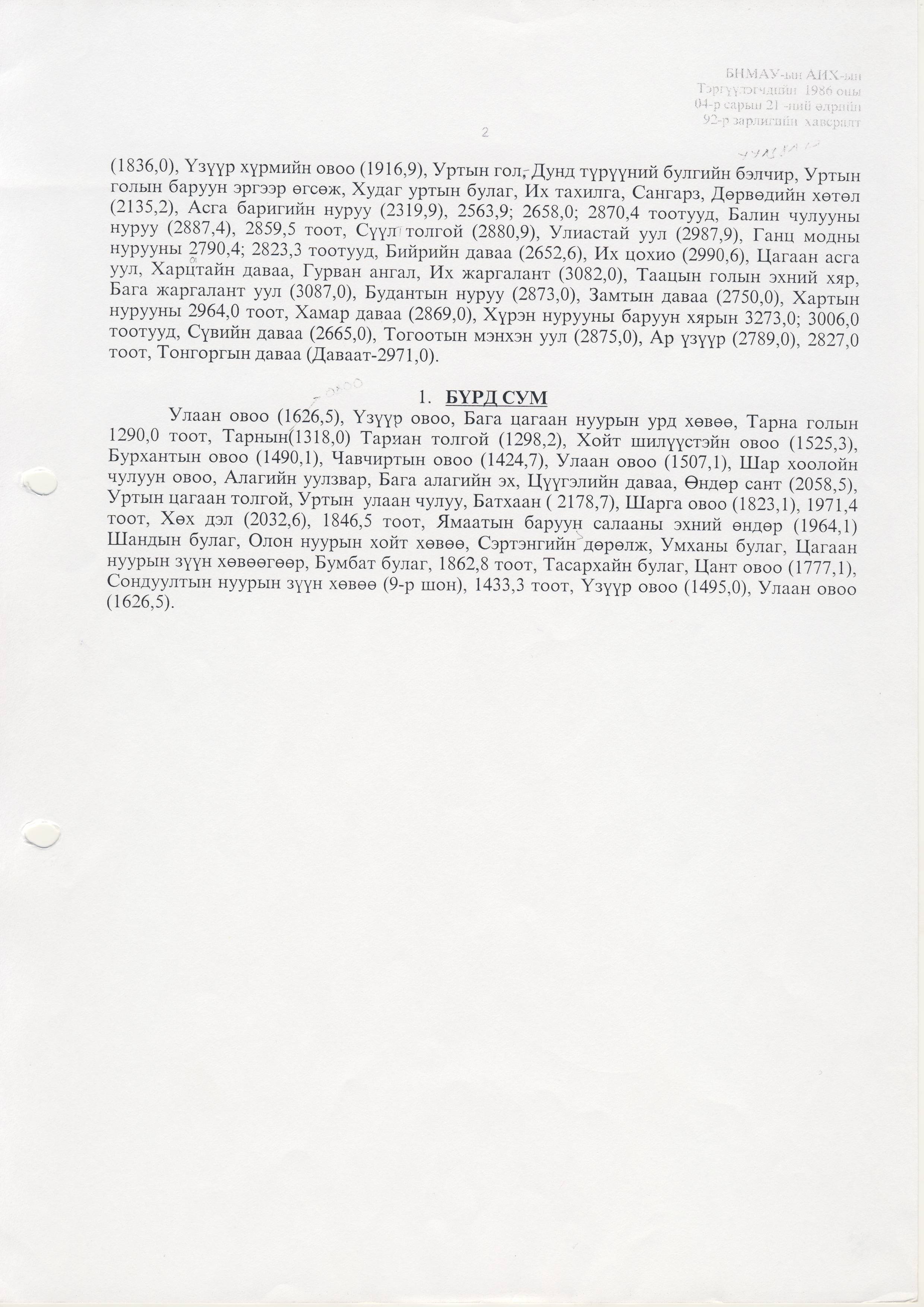 БНМАУ-ын Ардын Их Хурлын Тэргүүлэгчдийн 1986 оны 04 дүгээр сарын 21-ний өдрийн 92 дугаар зарлигийн хавсралтаар батлагдсан Өвөрхангай аймгийн хил /Бүрд сумын хил цэс өөрчлөгдсөнтэй холбоотойгоор Бүрд сумын хилийн цэс/-ийг тус тус баталсан байдаг.