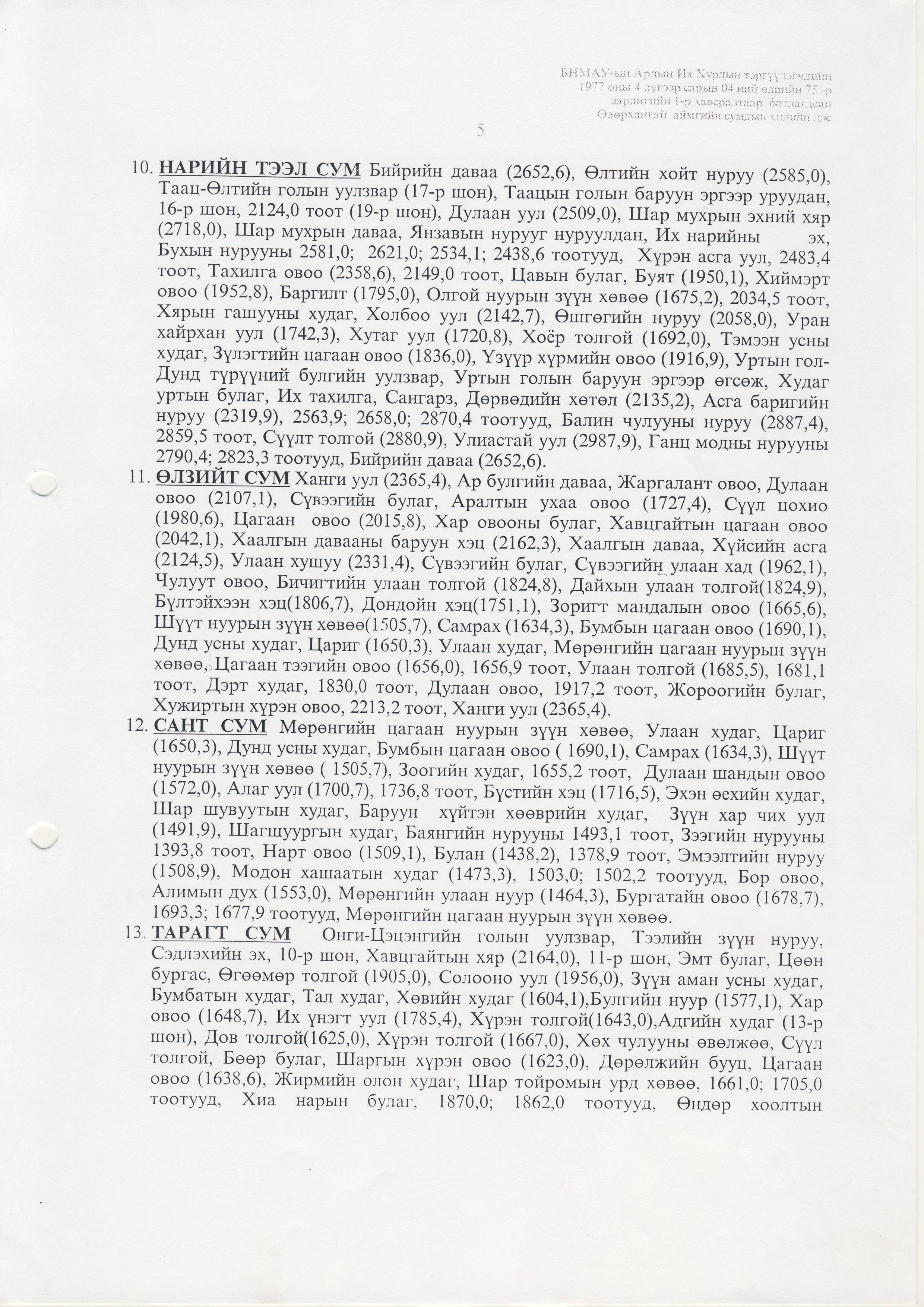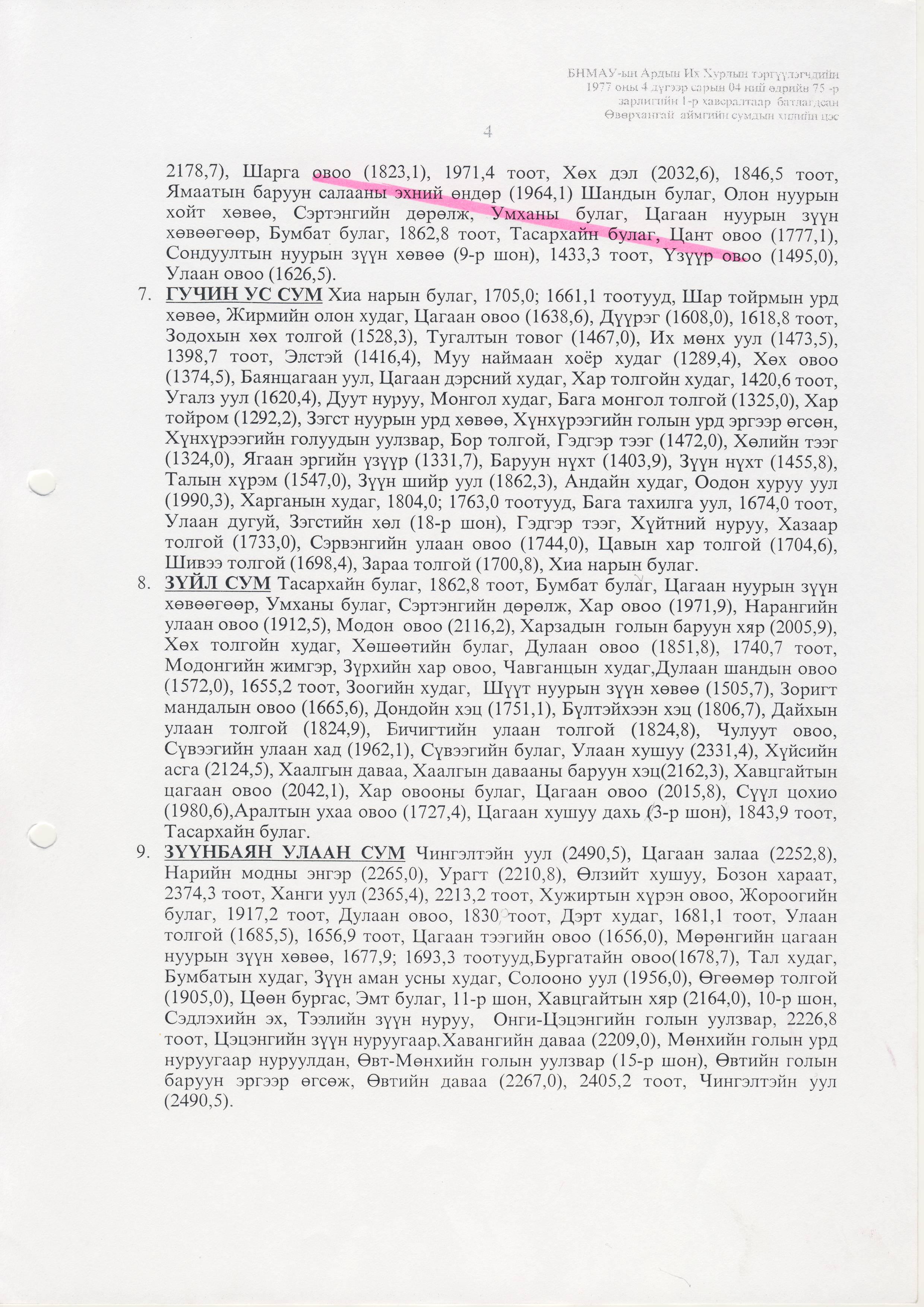 БНМАУ-ын Ардын Их Хурлын Тэргүүлэгчдийн 1977 оны 04 дүгээр сарын 04-ний өдрийн 75 дугаар зарлигийн 1-р хавсралтаар батлагдсан Өвөрхангай аймгийн сумдын хилийн цэс
